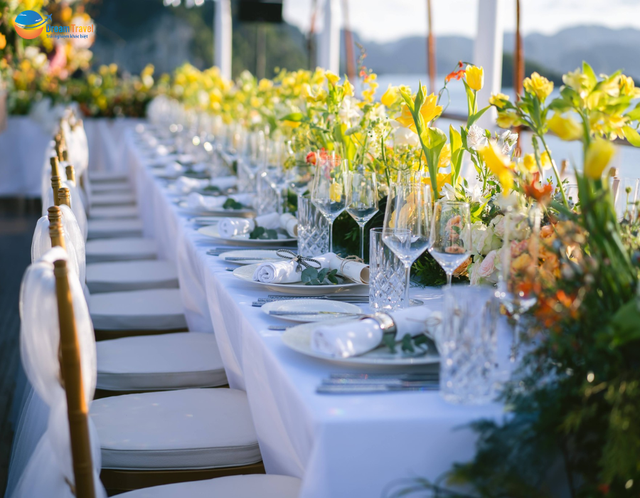 Thưởng thức bữa tiệc cuối năm trên du thuyền Hạ Long cũng là cơ hội để khám phá thế giới ẩm thực phong phú, nơi bạn được phục vụ những món ăn độc đáo từ các đầu bếp chuyên nghiệp.