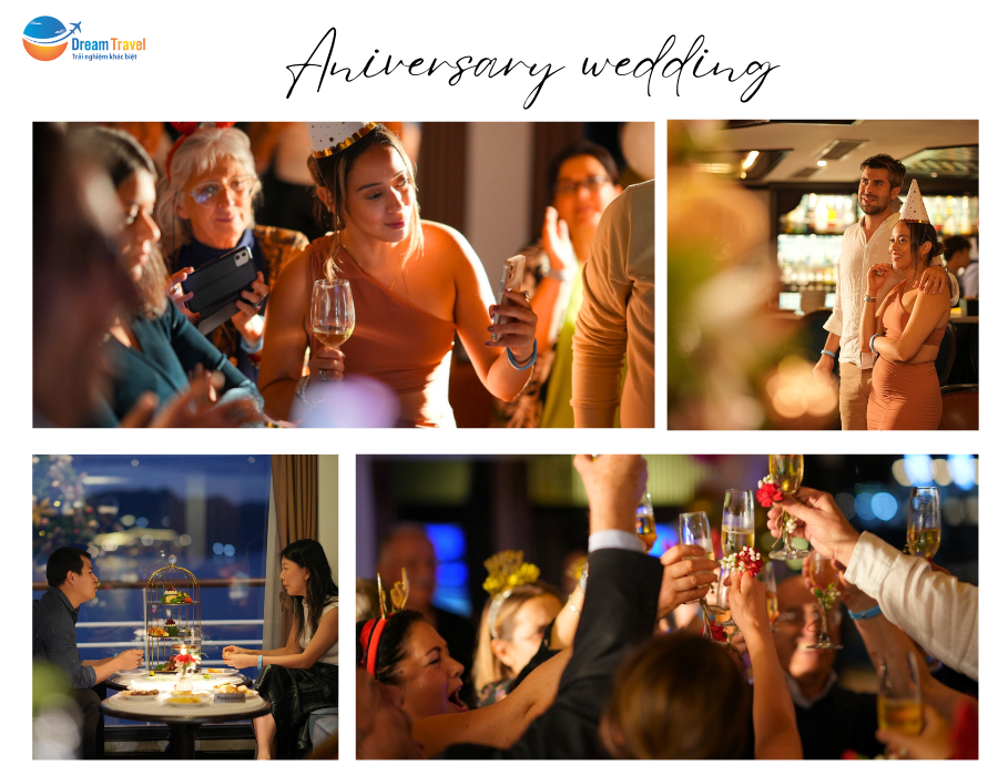 Kỷ niệm ngày cưới: Kỷ niệm ngày cưới trên du thuyền vịnh Hạ Long sẽ là một món quà tuyệt vời dành cho cả hai vợ chồng. Hãy cùng nhau tận hưởng những ngày tháng ngọt ngào, khám phá vẻ đẹp của vịnh Hạ Long, thưởng thức những món ăn ngon và cùng nhau viết tiếp câu chuyện tình yêu của mình.