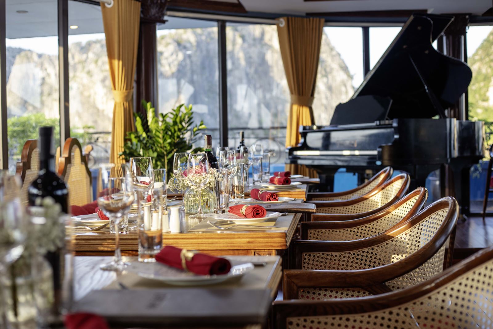 13h00: Bạn sẽ được thưởng thức bữa trưa tại nhà hàng trên tàu và tận hưởng khung cảnh tuyệt vời của vịnh Hạ Long.