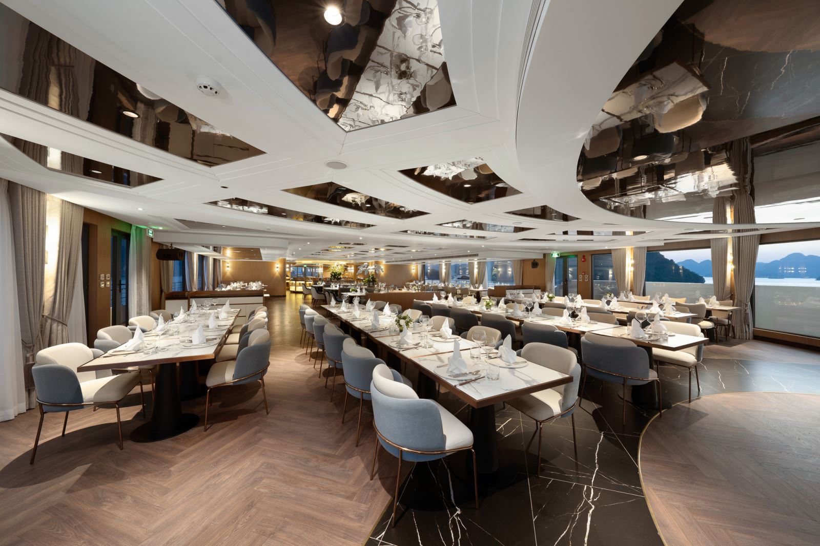 - *Hải trình có thể thay đổi tùy thuộc vào điều kiện thời tiết mà không báo trước. Wi-Fi có sẵn trong khu vực nhà hàng/quầy bar, nhưng kết nối internet bị hạn chế do địa lý của Vịnh Hạ Long.