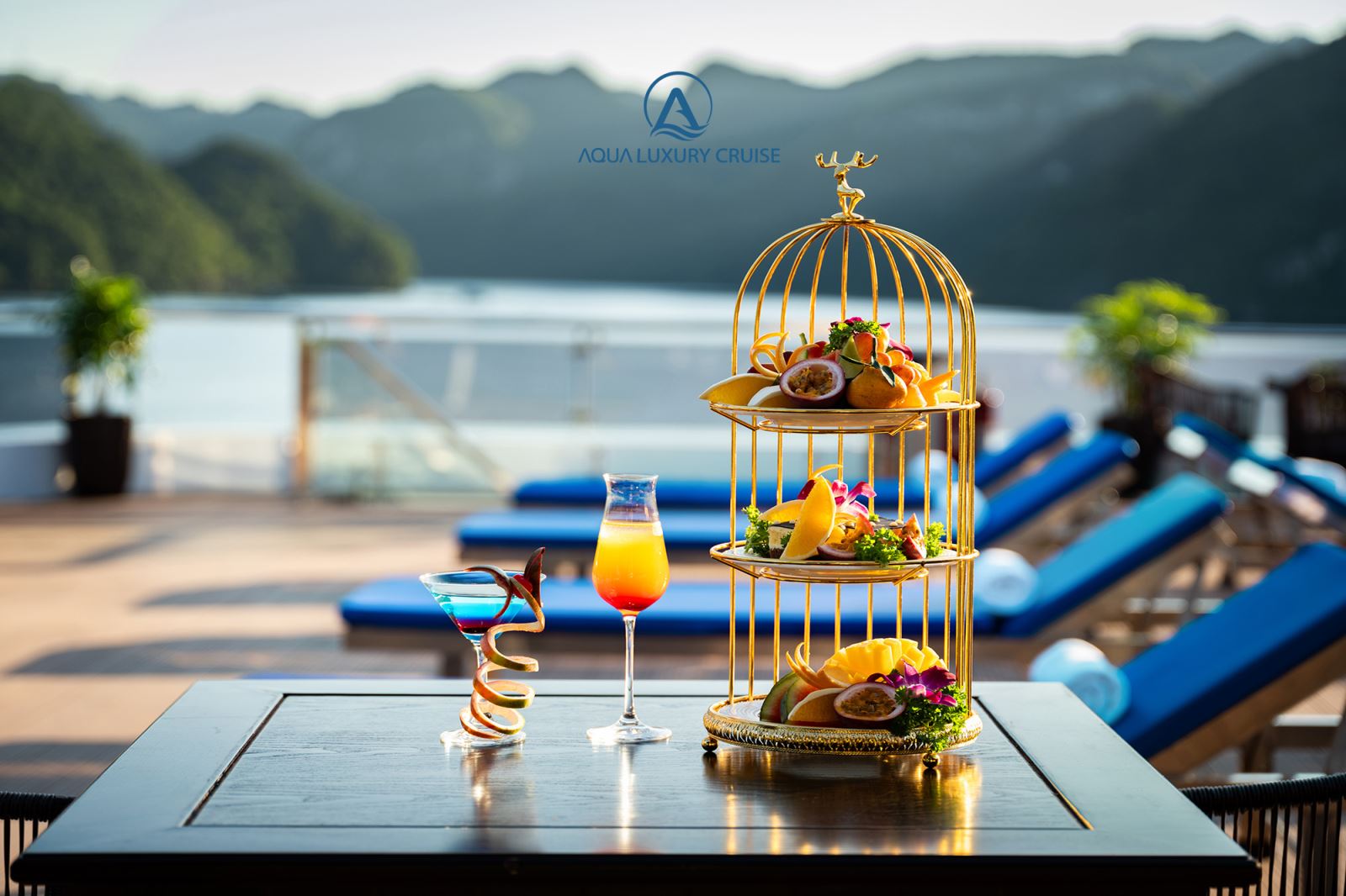 Thưởng ngoạn Vịnh về đêm trên sân thượng, nhâm nhi tại quầy bar, nghe nhạc, chơi bài, xem phim, câu mực,… hoặc massage thư giãn. Ngủ đêm trên du thuyền Aqua Luxury