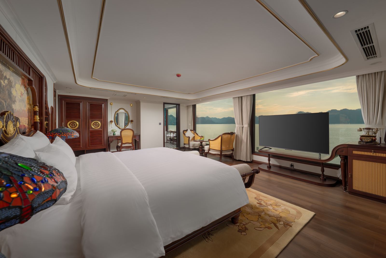 Ngoài ra, du thuyền còn cung cấp các tiện nghi và dịch vụ đẳng cấp như dịch vụ phòng 24/7, quản gia riêng cho phòng VIP, bồn tắm Jacuzzi, phòng xông hơi đá muối Himalaya, bể sục ngoài trời, thang máy hiện đại, cùng tiệc trà Canape sang trọng.