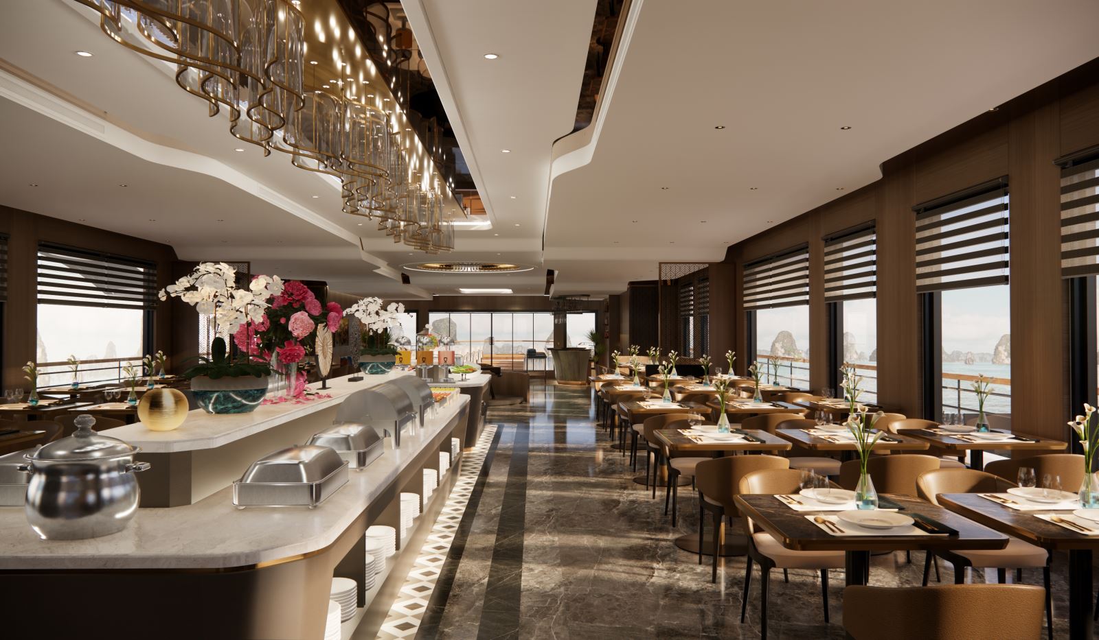 Nhà hàng trên du thuyền mang đến hành trình khám phá ẩm thực tinh tế với thực đơn phong phú, kết hợp hài hòa giữa món Á – Âu và hải sản tươi sống. Mỗi món ăn đều được chế biến công phu từ nguồn nguyên liệu chọn lọc, đem lại trải nghiệm vị giác đầy ấn tượng.