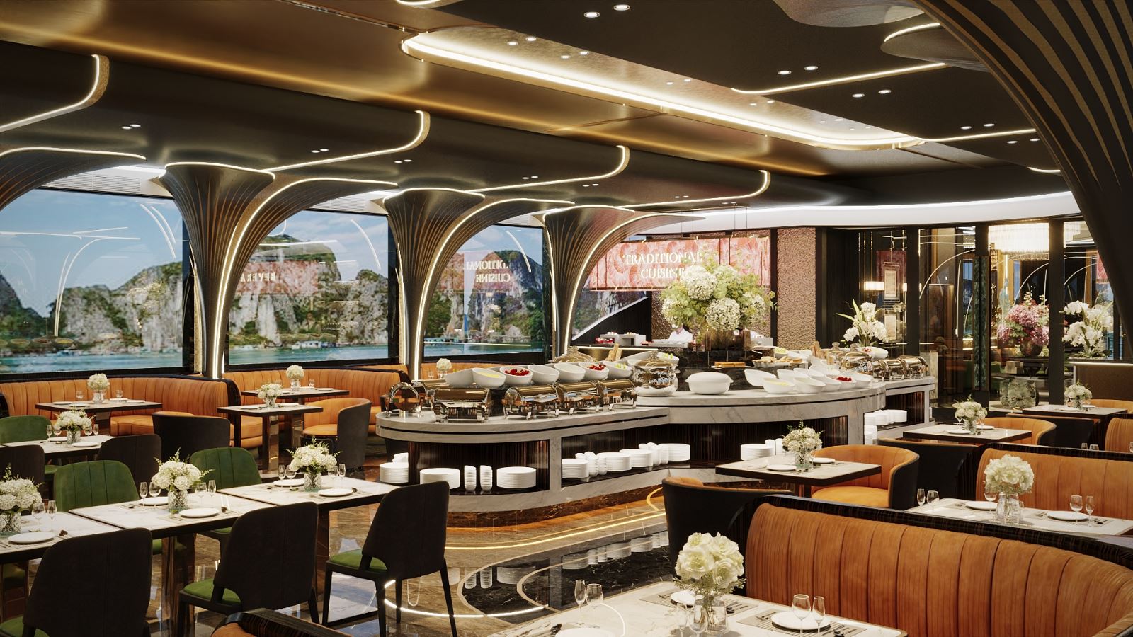 Ngắm nhìn các khối núi đá vôi hùng vĩ, thư giãn trên boong tàu, khu vực bể bơi bốn mùa hoặc trong không gian nhà hàng sang trọng.