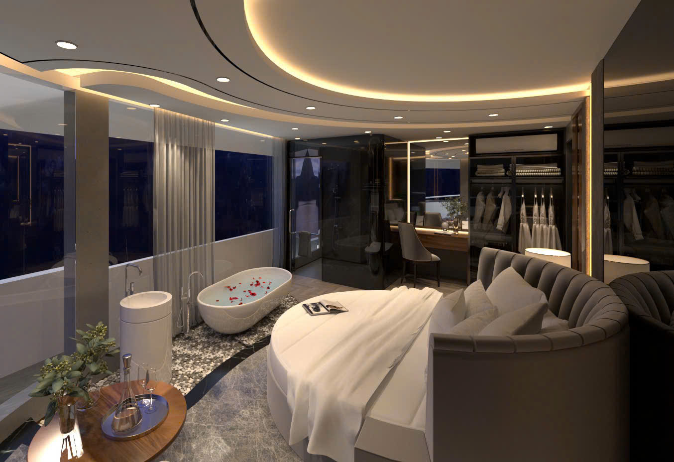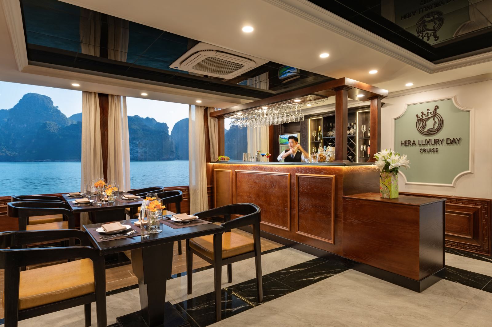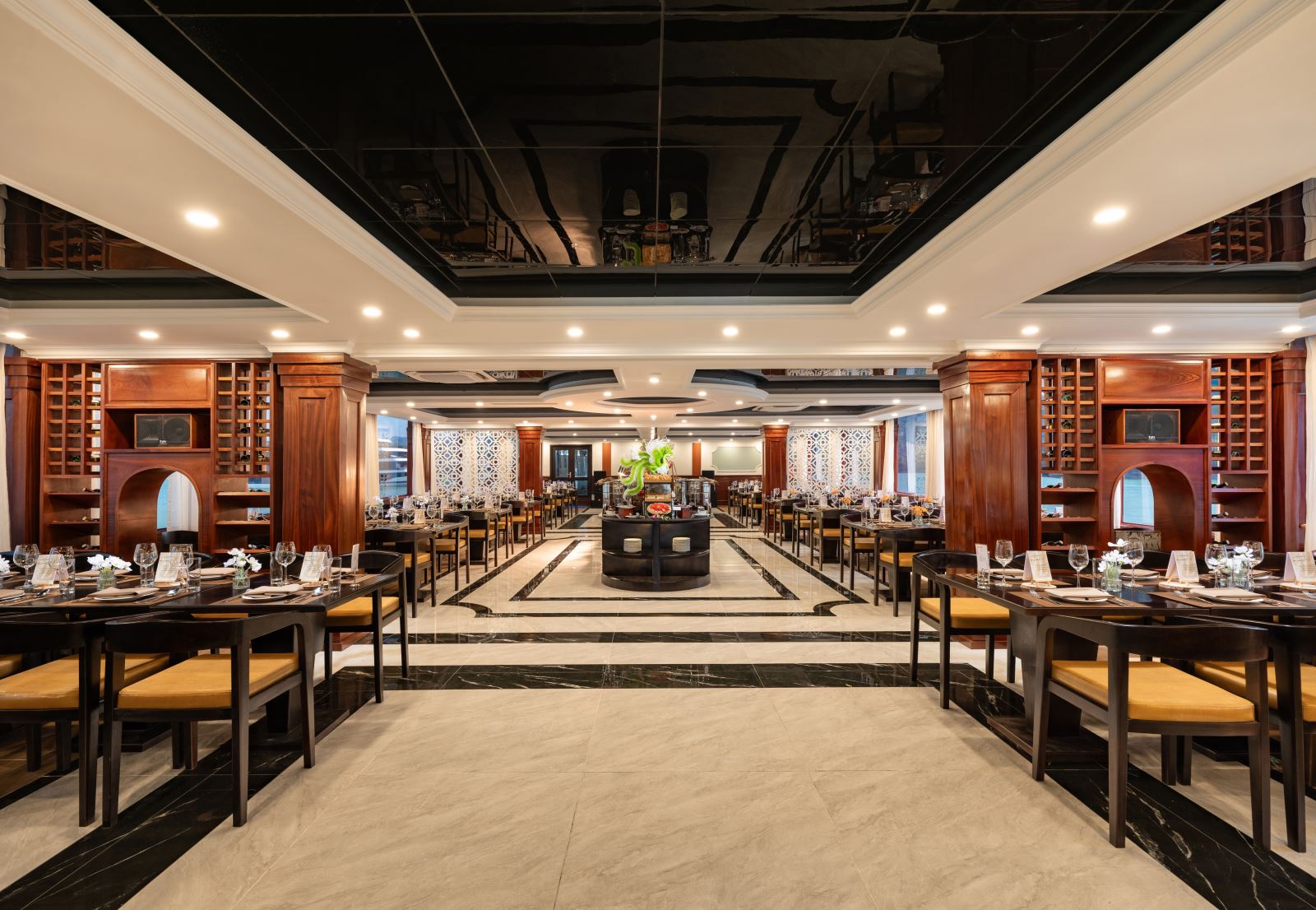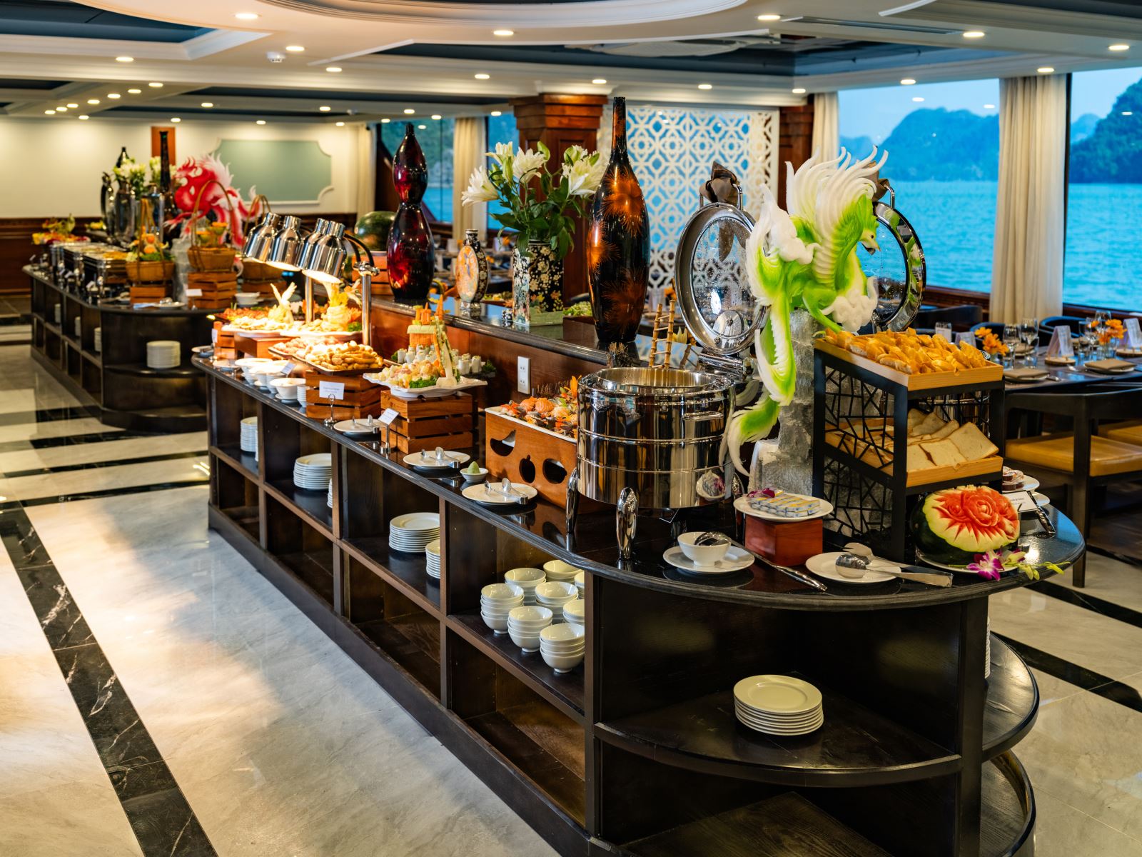 Thưởng thức buffet hải sản, súp tôm hùm, với các món Âu – Á kết hợp, được chuẩn bị bởi đầu bếp 5 sao. Mọi bàn ăn đều có tầm nhìn toàn cảnh vịnh – nơi từng con sóng như đang vẽ nên bức tranh thủy mặc.