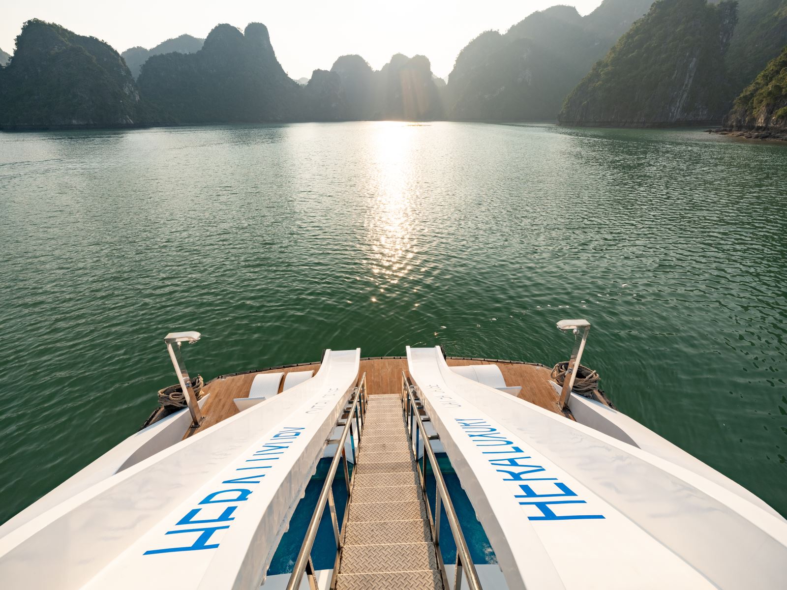 Bước chân lên boong tàu, bạn sẽ được đón bằng múa lân-biểu tượng của sự may mắn trước chuyến đi, quý khách thưởng thức ly welcome drink mát lạnh trên tay và chuẩn bị cho hành trình 7 tiếng khám phá Vịnh Hạ Long và Vịnh Lan Hạ xinh đẹp Khi du thuyền rời cảng, trước mắt Quý khách mở ra bức tranh thiên nhiên hùng vĩ của Vịnh Hạ Long và Vịnh Lan Hạ – nơi những đảo đá lớn nhỏ như Hòn Con Vịt, Hòn Ngón Tay hiện lên giữa làn nước xanh biếc, đẹp tựa kiệt tác giữa trời và biển
