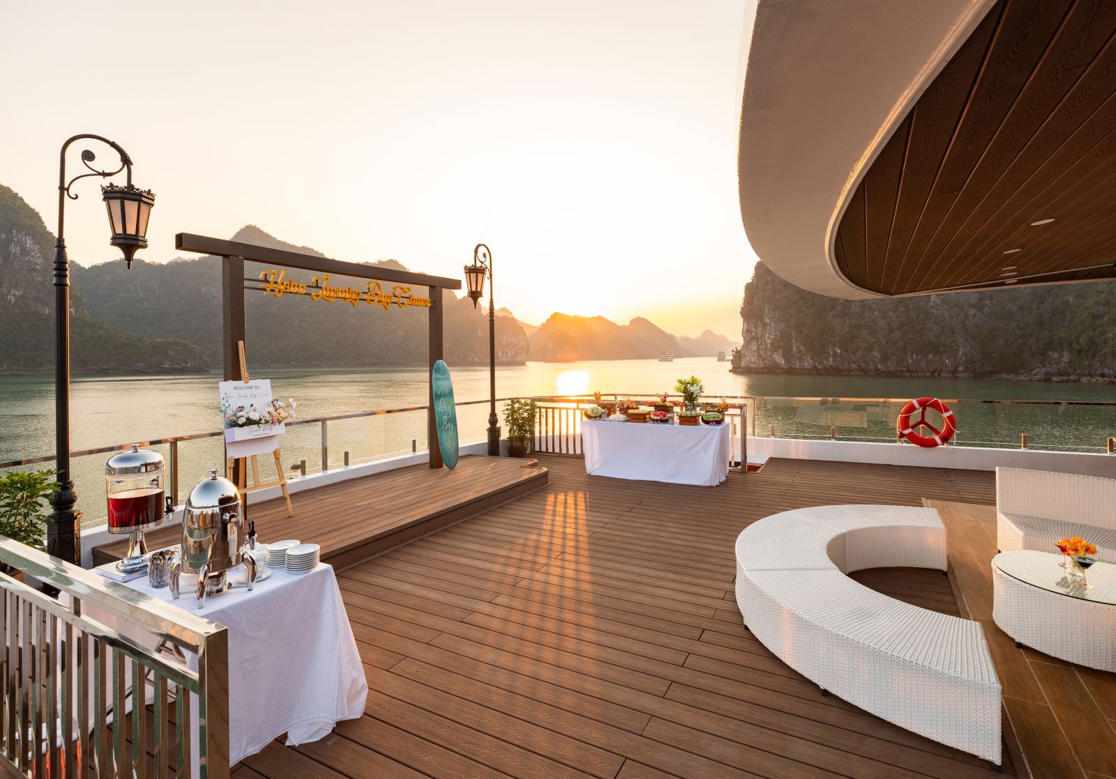 Du khách tham gia hoạt động Tiệc trà chiều, ngắm hoàng hôn buông trên vịnh với trà, cà phê và bánh ngọt. Chương trình HAPPY HOUR – Mua 2 tặng 1 đồ uống trong khung giờ 16:00–17:15 hằng ngày bao gồm các đồ uống: Cocktails, Mocktails, mixed drinks.
